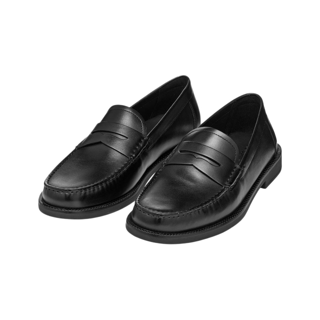 Traditional Refinement: A classic black leather loafer that prioritizes a perfect fit and all-day breathability for the working professional.