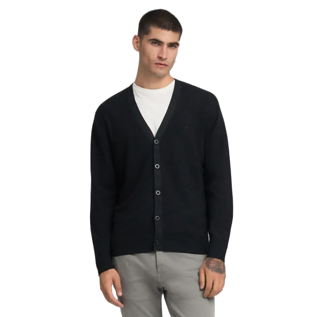 REPLAY WOOL BLEND FAST DYED CARDIGAN (Black): An essential black wool-blend cardigan. The 12-gauge knit provides perfect warmth and a refined structure, ideal for versatile styling.